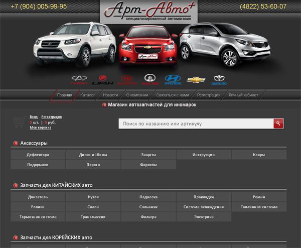 Магазин автозапчастей в достаточно скромном оформлении с серыми однотонными страницами. Статичное фото нескольких моделей машин в хэдере на главной, поиск по названию товара или артикулу, список категорий и типов товаров, а также приветственная статья на главной – уже дадут представление о магазине.