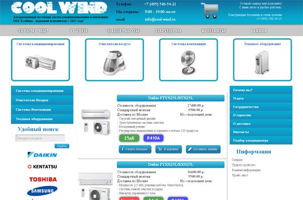 Магазин продажи очистителей воздуха, кондиционеров, обогревателей, вентиляторов, и т.д. Оформлен в светлых холодных тонах, которые ассоциируются с чистотой воздуха, а именно голубой и белый. Товары с основными характеристиками, описанием и фото разместились тут в столбик, так проще прокручивать и искать нужную модель. Категорий всего 4, так как направленность магазина достаточно узкая. Но есть также удобный поиск не только по типам товаров, но и по производителям.