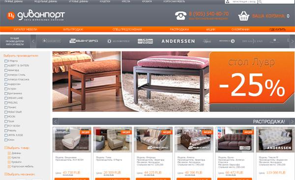Этот онлайн магазин является интернет аналогом оффлайн сети мебельных салонов. Такие сайты обычно оформляются в фирменном стиле торговой марки. В данном случае мы видим два основных оттенка цветовой гаммы — оранжевый и серый. Удобная структура страниц, информация о распродажах и акциях, список производителей мебели в левом сайдбаре — всё интуитивно понятно и удобно расположено на главной. Простая навигация, а также поэтапное оформление заказа для гостей тут также присутствуют.