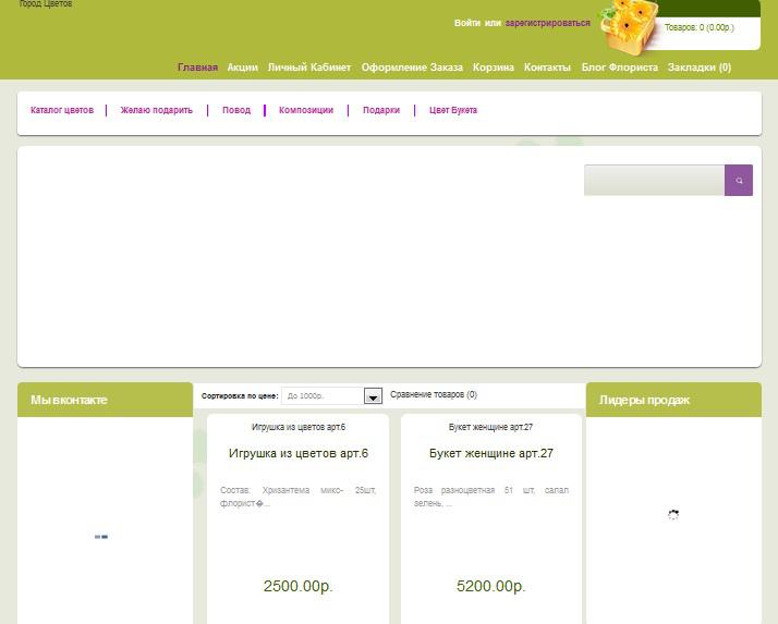 Магазин с названием Город цветов оформлен так, как природа оформляет свои творения. Салатный и фиолетовый оттенки тут являются основными в оформлении страниц, малиновый — в оформлении некоторых шрифтов. Букеты, экибаны, просто живые цветы в слайдах и на фото товаров также дополняют цветовую гамму веб-страниц. Очень красивый и оригинальный магазин.