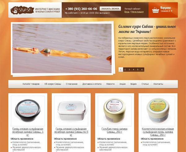 Магазин косметики, сделанной на основе лечебных солей и грязей. Оформлен в тёплых оттенках, персиковый фоновый оттенок сочетается с коричневым и красным тонами в оформлении отдельных графических элементов на страницах. Оригинально оформлено слайд-шоу в виде стопки из фотографий, удобная навигация и приятное оформление тут созданы очень удачно.