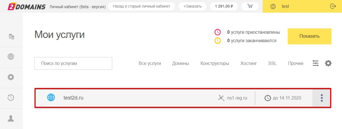 Авторизуйтесь в Личном кабинете 2domains и выберите нужный домен: