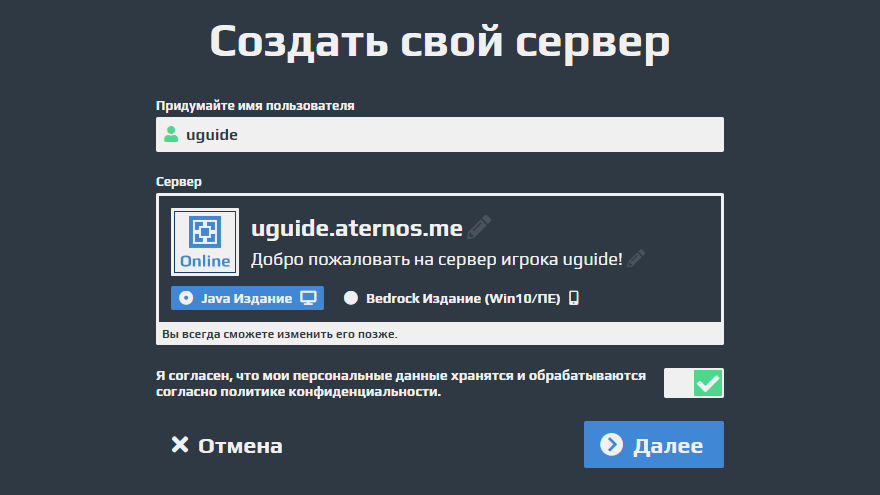 1. Заходим на сайт Aternos и регистрируемся придумав имя пользователя и заполнив все остальные данные;