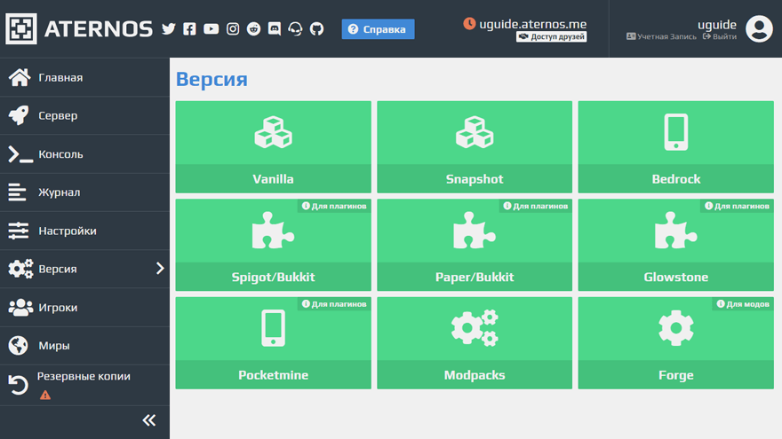 Фишка хостинга — установка в один клик любой версии игры и плагинов.