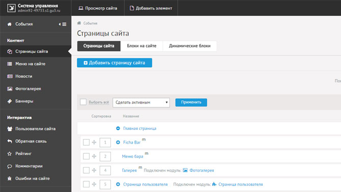- Страницы сайта – добавление/удаление статических страниц, редактирование содержания каждой из них, привязка к пункту меню, возможность вставки кода HTML. Здесь же создаются/редактируются динамические (галереи, форумы, новости и т. д.) и обычные блоки (логотип, телефон, адрес, карта и т. д.) по тому же принципу;