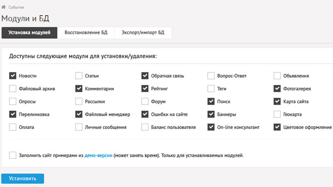 - Модули и базы данных – здесь можно подключать новые модули на сайт (их около 30 штук), восстанавливать, а также производить импорт/экспорт базы данных;
