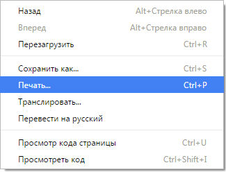 1. Щелкните по пустому месту страницы правой кнопкой мышки. Из списка выберите «Печать…». Или нажмите сочетание клавиш Ctrl+P (англ.)