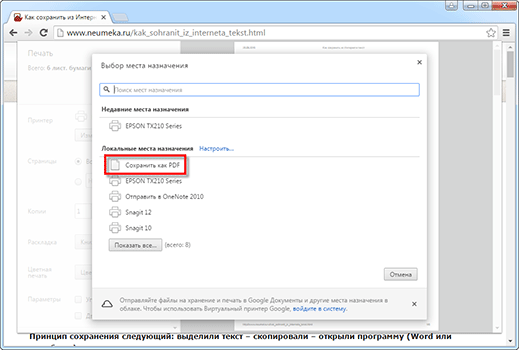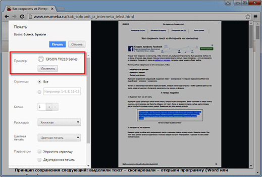 Данный способ, пожалуй, самый простой. Для этого вам нужно иметь текстовый редактор Word от компании Microsoft. Выделяем статью или ее фрагмент, копируем, нажимая для этого сочетание клавиш Ctrl + C, открываем Word и при помощи клавиш Ctrl + V вставляем в документ Word. Если вам нужно выделить не весь текст страницы, а лишь несколько абзацев в разных местах веб-страницы, то воспользуйтесь нехитрым приемом, который мы описывали в этой статье.