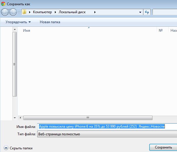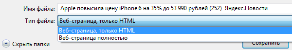 Тип файла. Здесь вы выбираете тот тип, который вам нужен. Рассмотрим их различия. При выборе типа «Веб-страница полностью» будет сохранена не только веб-страница, но и все изображения, скрипты, стили. Все они будут хранится в отдельной одноименной папке.