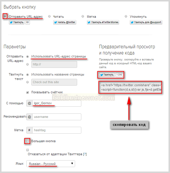А теперь непосредственно переходим к получению кнопки для расшаривания от Твитера. Для этого нужно оказаться на официальной странице конструктора и произвести соответствующие настройки: