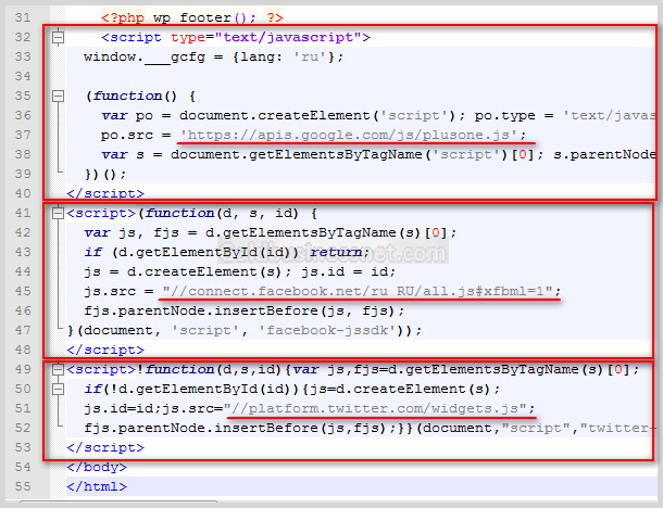 Итак, надеюсь, вы поняли, как и куда вставлять полученные коды для кнопок соцсетей. Для закрепления, как и обещал приведу пример, как размещены части кодов четырех кнопок самых популярных социальных сетей у меня на блоге. Для начала скриптовые части кодов кнопок в шаблоне FOOTER (для VKontakte, по рекомендации, если помните, мы поместили скрипт между тегами HEAD, обратите внимание на скриншот выше):