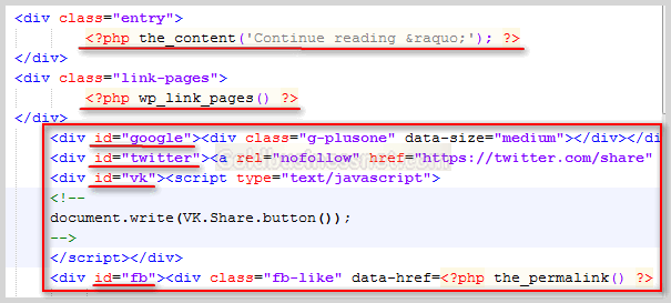 А вот участки, отвечающие собственно за месторасположение социальных кнопочек (SINGLE.PHP):