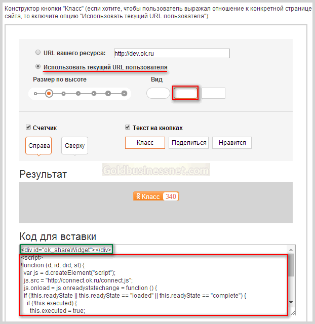 Для сайта Одноклассники существует конструктор кнопки «Класс», которая по функционалу является ни чем иным как «Поделиться», несмотря на то, что надпись можно выбрать из трех предлагаемых вариантов: