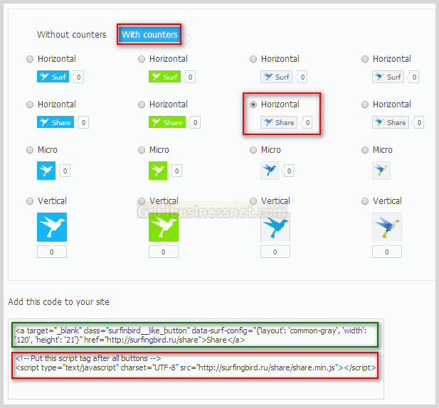 Ежели желаете получить кнопку со счетчиком, вверху нажимаете «With counters». В конструкторе выбираете понравившуюся кнопку, просто щелкнув по ней. В результате снова получаем два куска code. Скрипт (выделен красным):