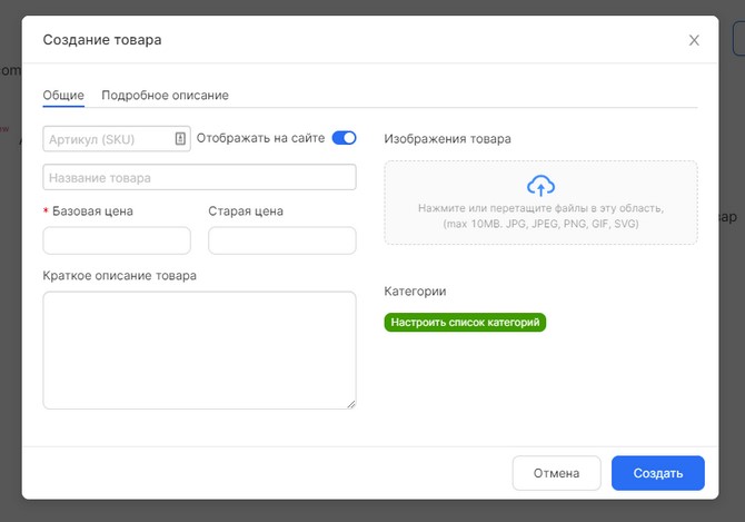 Настроек у каждого отдельного товара немного, только базовые: цена новая/старая, артикул, изображения, краткое и подробное описание, принадлежность к категории. В настройках сайта можно добавить способы оплаты и доставки. Довольно много параметров у корзины – оформление, поведение, поля для заполнения, постановка целей по идентификаторам. Есть возможность ввода промо-кодов.