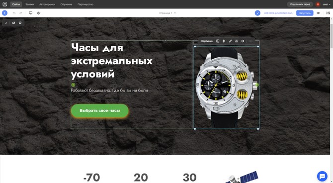 Основной упор сделан на редактирование внешнего вида шаблона или построение лендинга с нуля. Визуальный редактор, как мы говорили, сильно напоминает Photoshop и отнимает как минимум не меньше времени. Здесь также приходится работать со слоями, изменяя элементы страницы. Настроить можно все: размер и положение изображения, цвет, кегль, шрифт текста.