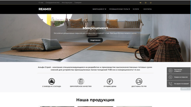 Топ-пол.рф – сайт компании «Альфа Строй», реализующей сухие смеси для устройства полов собственного производства. Навигация по сайту организована с помощью двух видов меню. В правой части экрана закреплена квиз-форма, которая включает в себя калькулятор расчета стоимости и виджет заказа обратного звонка.