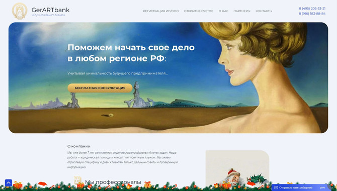 Gerartbank.ru – сайт компании, оказывающей помощь в решении различных бизнес-задач. Разработчики сделали акцент на обратную связь: контактные номера телефонов в шапке сайта, ссылки на форму обратной связи на первом экране и под каждым видом услуг в соответствующем блоке, виджет обратной связи, блок с контактами, включая мессенджеры.