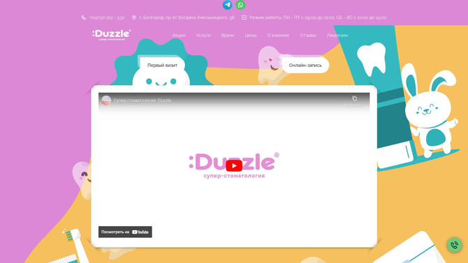 Duzzle.belstomat.ru – сайт детской стоматологии в Белгороде. На сайте можно заполнить документы, необходимые для первого визита в клинику, записаться на прием в онлайн-режиме, ознакомиться с видами предоставляемых услуг и прайсом.