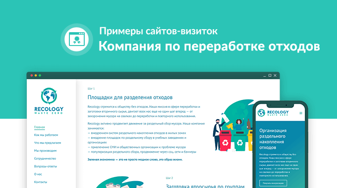 Меню выполнено в формате красивого сайдбара, содержащего также контактные данные. В мобильной версии оно преобразуется в гамбургер с плавной анимацией раскрытия. Логотип приятный, экологичный и стильный. Главная страница обосновывает подход компании к утилизации мусора, убедительно указывая на выгоды от раздельного накопления отходов. Есть раздел вопросов и ответов для дополнительного ликбеза. Контакты оформлены очень подробно, содержат юридические данные – всё выглядит прозрачно. Футер лаконично дублирует их и содержимое главного меню. Простая структура, симпатичный сайт. Хороший образец в своём роде.