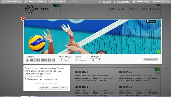 После создания сайта сервис предлагает познакомиться с основными возможностями, объясняя, какие элементы можно изменить, как это лучше сделать, чтобы привлечь внимание посетителей и т.д. Очень удобная фишка, особенно для начинающих разработчиков.