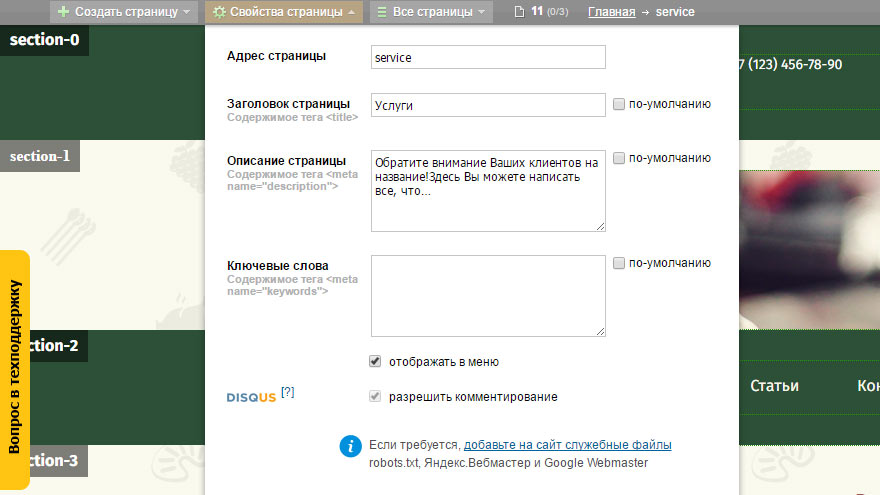 Кроме этого существует возможность заполнения метатегов Title и Description для страниц сайта, а также атрибутов alt и title для изображений с использованием продвигаемых ключевых слов.